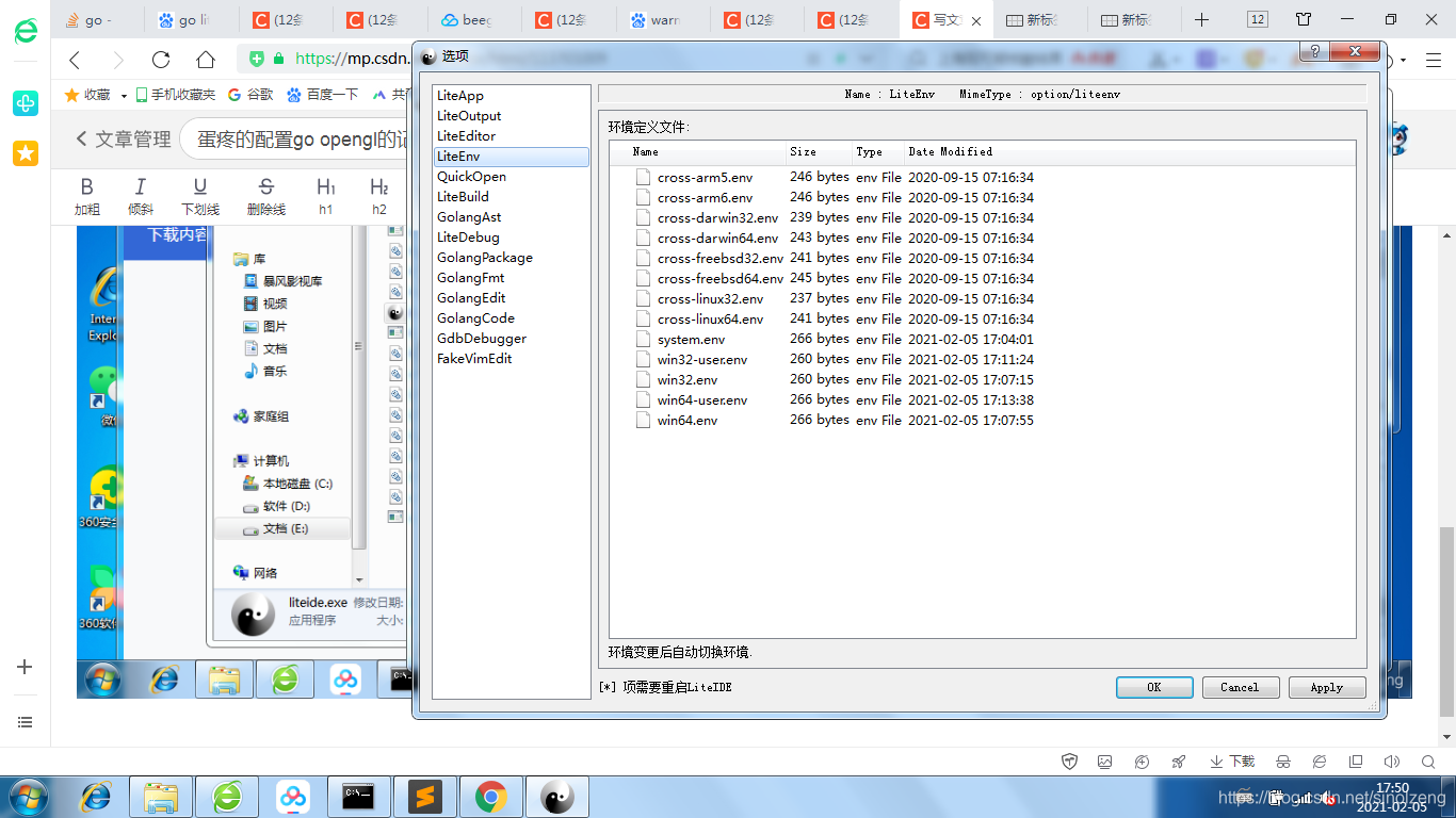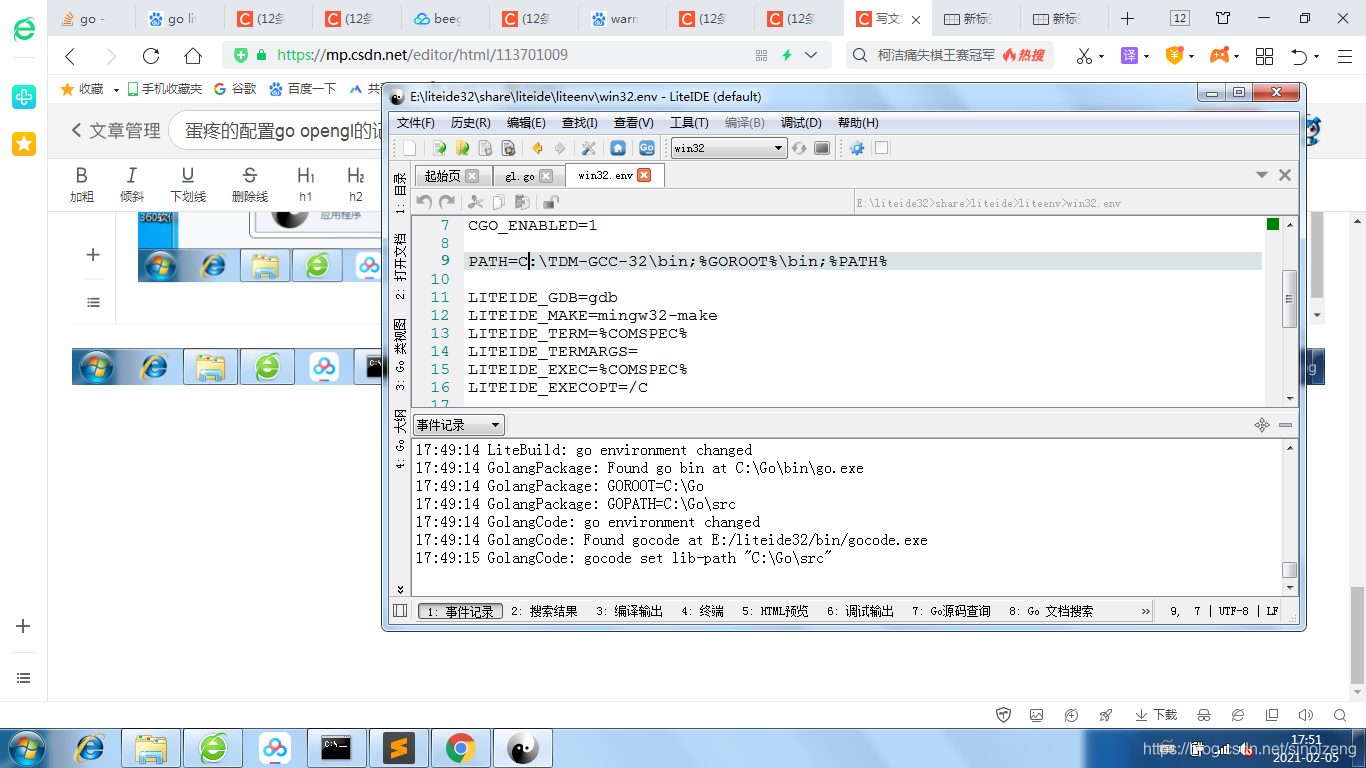两个弄完,保存,重启liteide,就可以了。然后在需要跑opengl32位程序的时候将运行环境从system改为win32就行了。