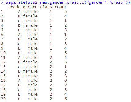 但这个表仍然不是个规范二维表,我们发现有一列(gender_class)的值包含多个属性(变量),使用separate()分开,separate用法如下: