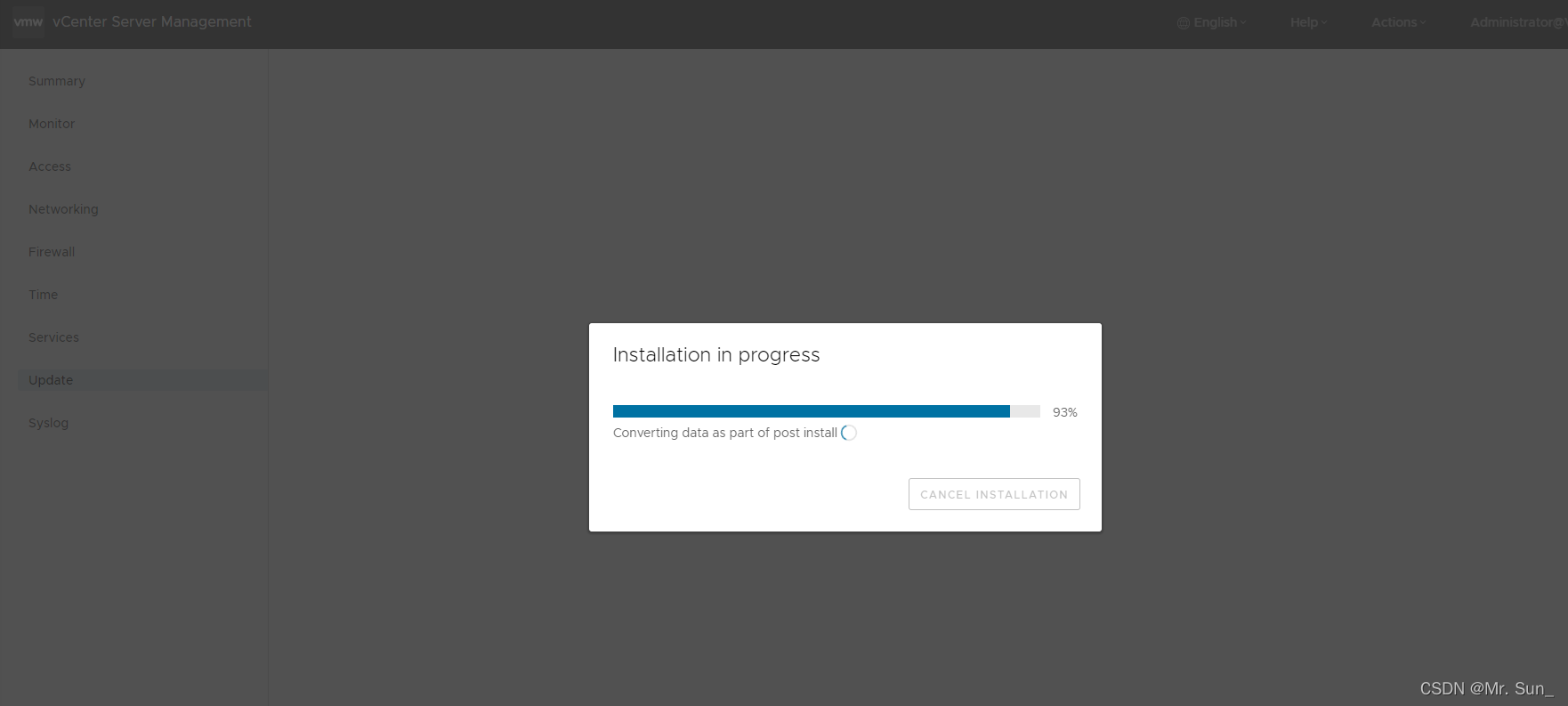6. 升级vCenter,需要等较长时间,卡在93%将近20分钟,耐心等待,不要做任何操作。