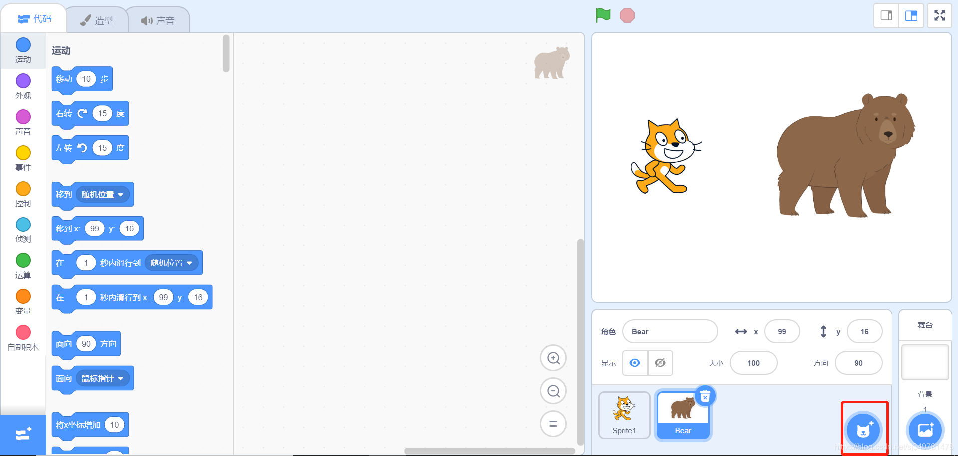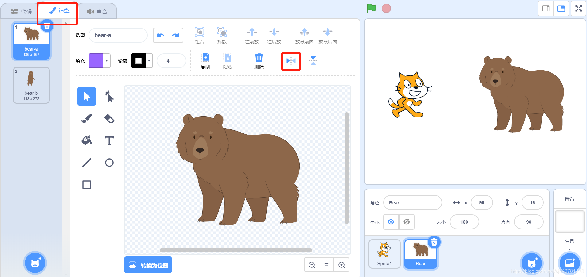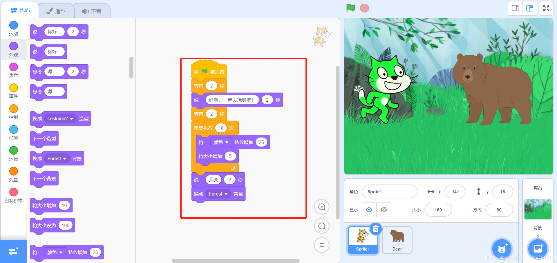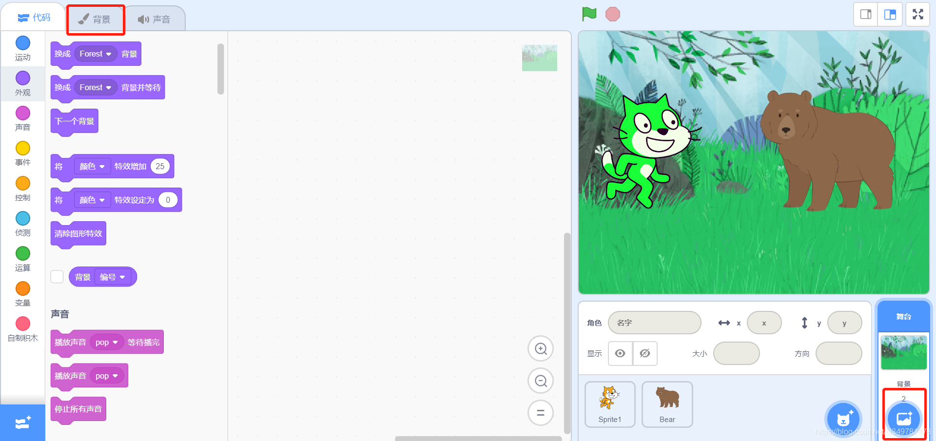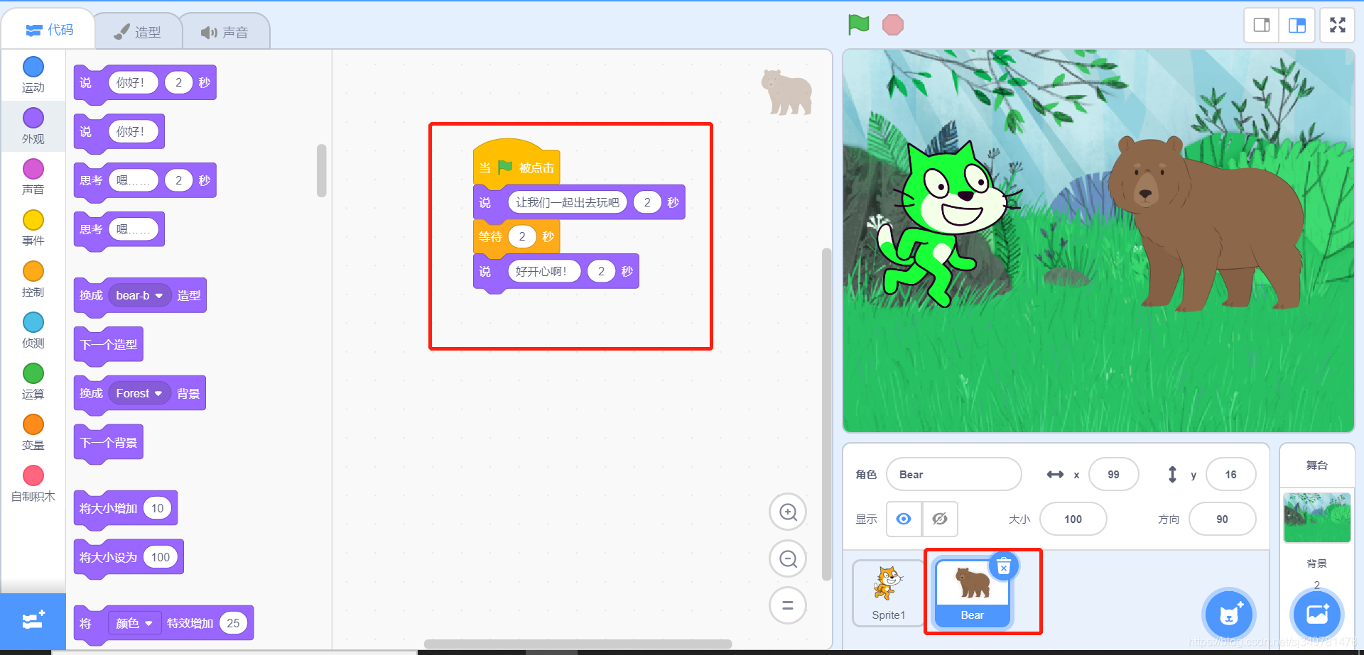 继续来看外观模块 , 创建两个造型,创建背景,创建造型特效(变大+变色)