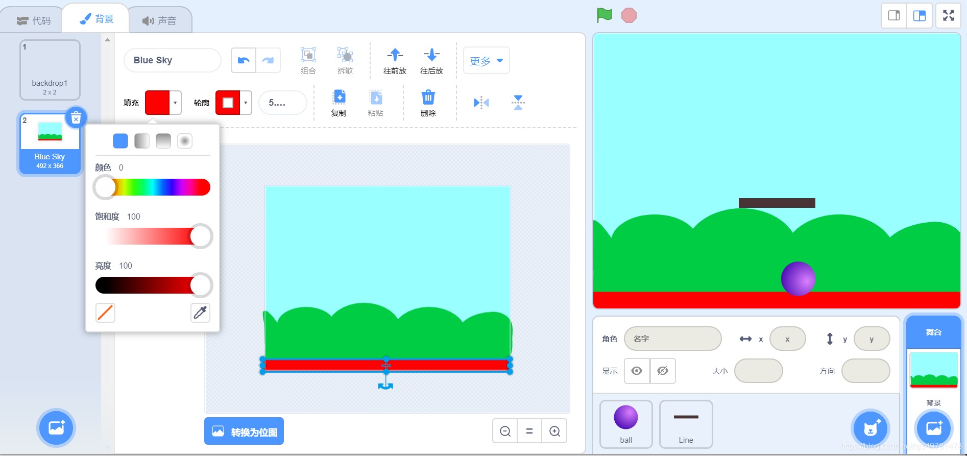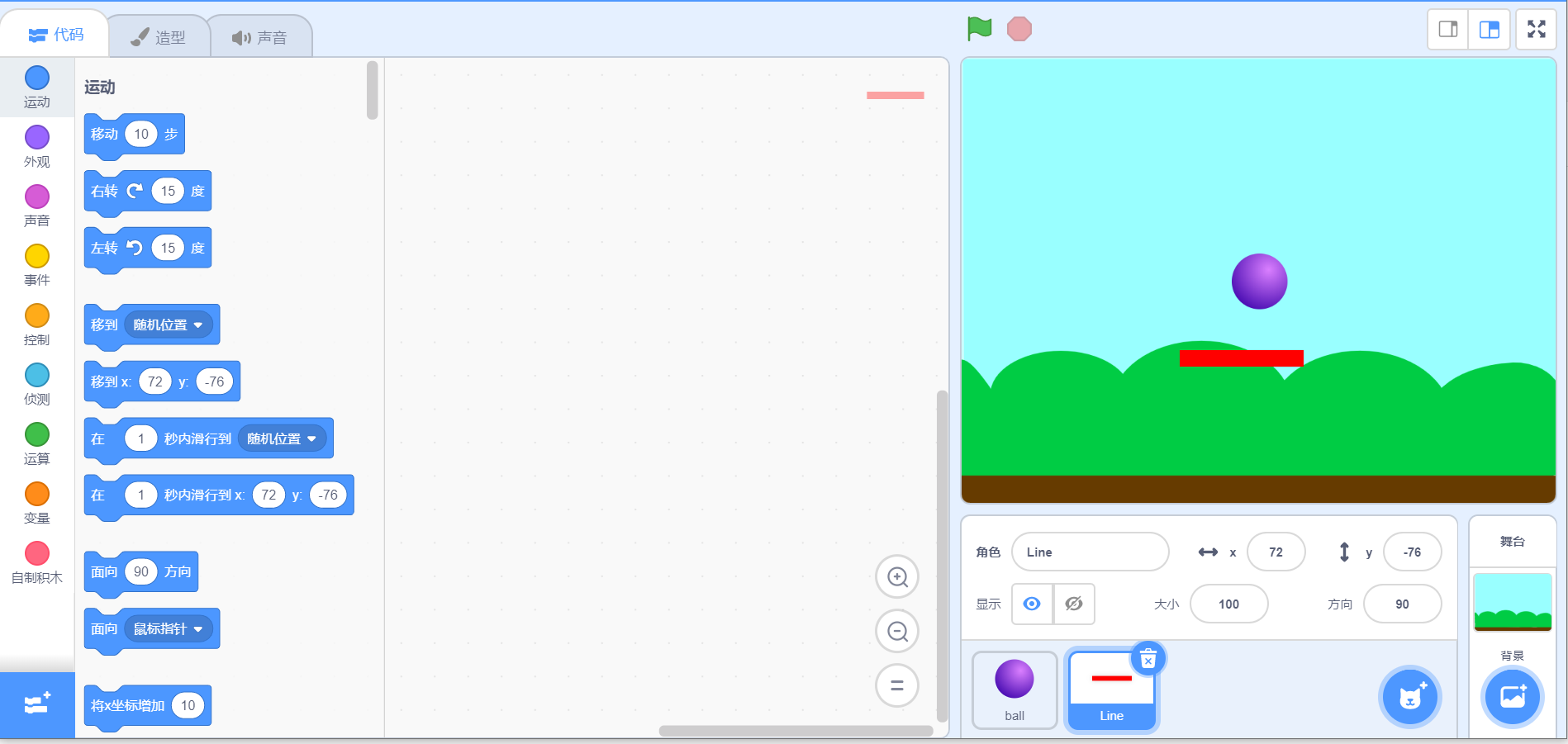 实现的目标,角色ball在舞台中随机移动,当角色ball触碰到角色line和舞台边缘时反弹。