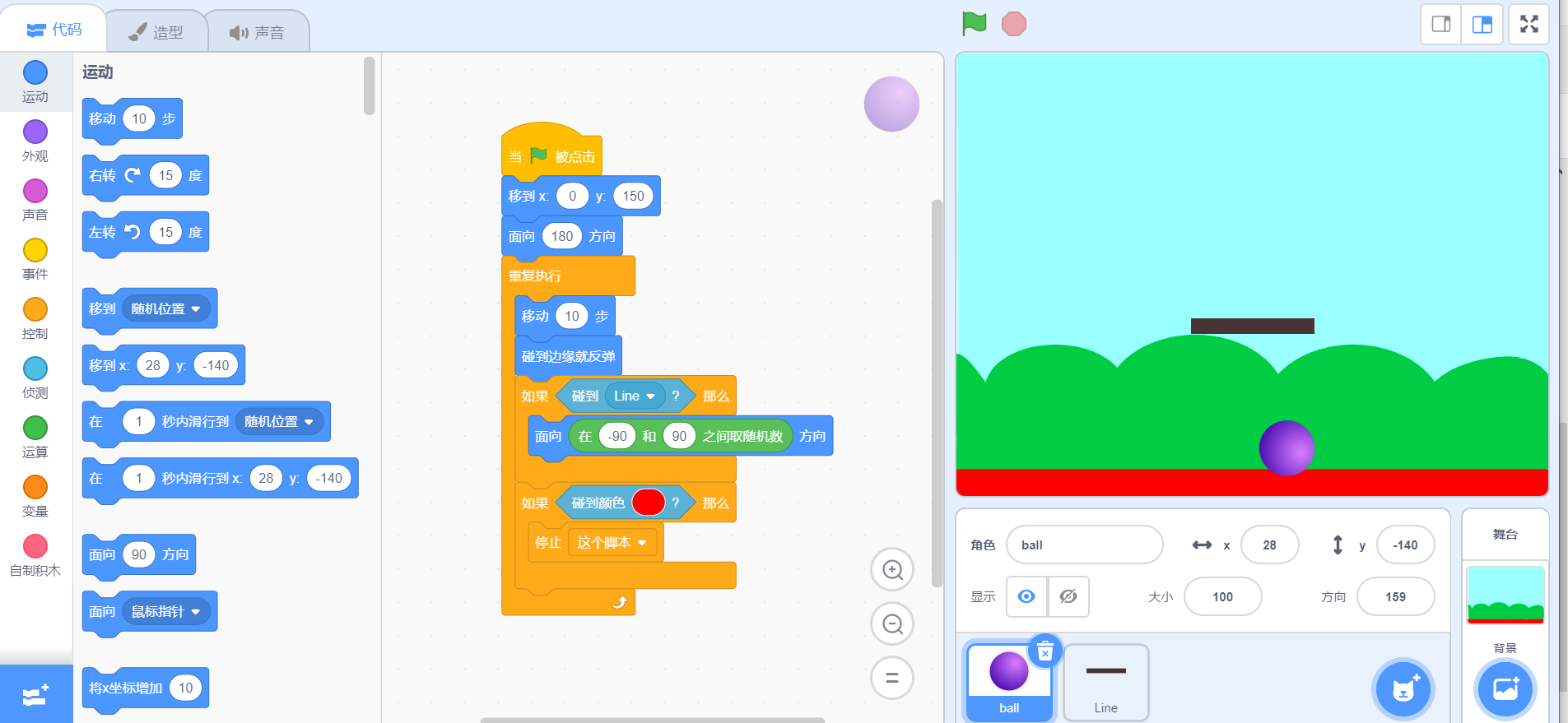 2.为角色ball添加代码。初始化位置;让小球面向下运动;执行循环,小球向下每次运动10步,碰到边缘就反弹;如果碰到角色line就向上随机反弹;如果碰到红色就停止脚本。