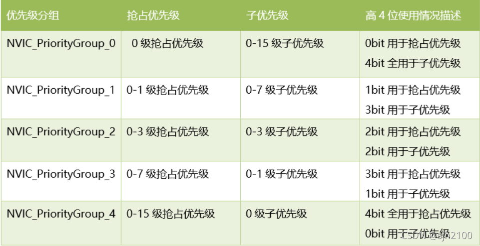 可以通过调用STM32的固件库中的函数NVIC_PriorityGroupConfig()选择使用哪种优先级分组方式,这个函数的参数有下列5种: