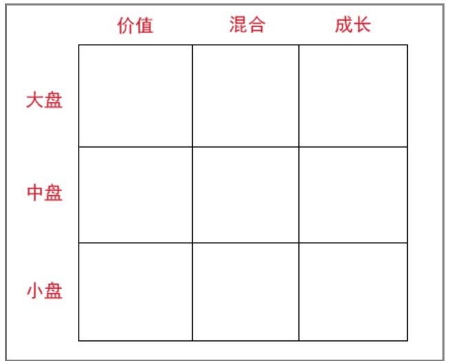 晨星投资风格箱法是目前使用最为普遍、最为著名的风格判别方法。晨星投资风格箱是一个3×3矩阵,把影响基金业绩表现的两项因素单列出来,把基金投资股票的规模风格定义为大盘、中盘和小盘;以基金持有的股票价值-成长特性为基础,把基金投资股票的价值-成长风格定义为价值型、平衡型和成长型。