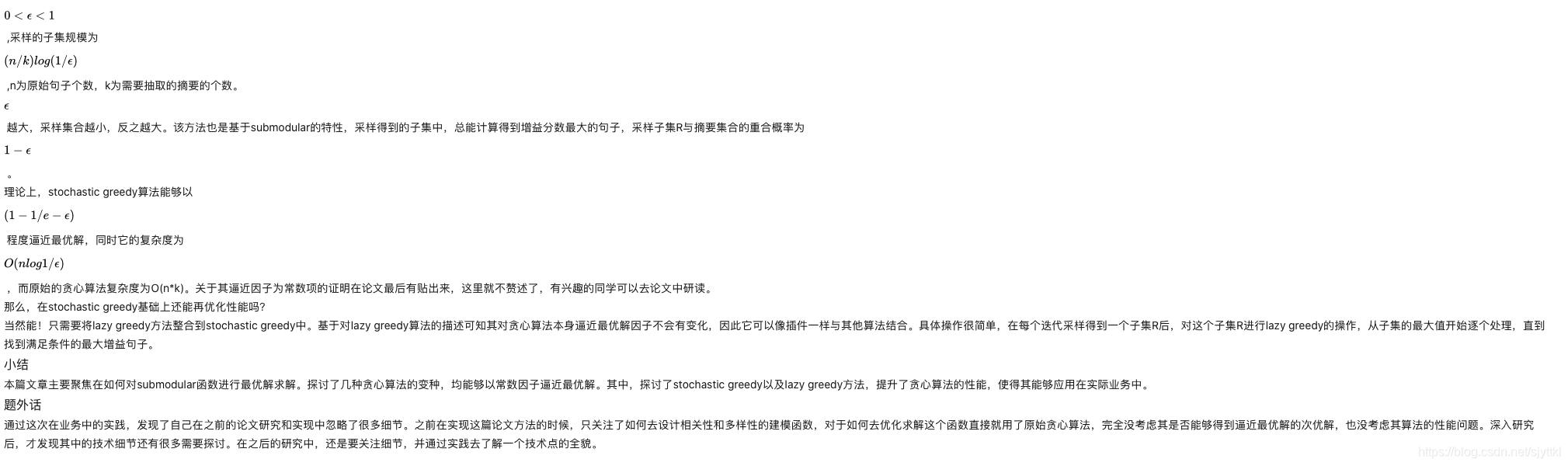 该算法相比于lazy greedy是真正优化了贪心算法的复杂度。其论文链接:Lazier Than Lazy Greedy 。它的算法核心思想非常简单,在原始贪心算法的基础上,在每轮迭代计算时,并不是对U中所有的句子都进行处理,而是随机采样一个子集,对这个子集进行循环计算。其中,引入一个超参数