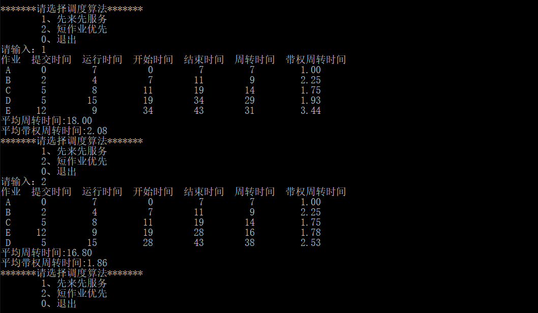 void menu(){int choice;while(1){printf("*******请选择调度算法*******\n\t1、先来先服务\n\t2、短作业优先\n\t0、退出\n请输入:");scanf("%d",&choice);if(choice==0){break;}else if(choice==1){fcfs();}else if(choice==2){sjf(); }else{printf("输入有误!\n"); }}