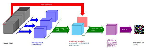 DISCo将深度学习网络的优势与最先进的实例分割程序相结合,允许直接提取单元实例而无需任何复杂的后处理步骤。他们还以非常有效的方式利用钙成像视频的时间背景来计算像素之间的分段相关性。然后以摘要图像的形式将此时间信息与基于形状的信息相结合。