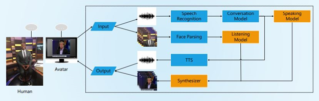 语音识别模型将语音音频变换为文本,然后传递到会话模块中以生成响应语句,该响应语句被传递到文本到语音(TTS)模块以合成语音。响应语句被传递到序列到序列的说话模型,其输出也被输入到虚拟合成器中以产生逼真的面部图像,从而呼应语音内容。头像合成器则用于在整个对话期间收听和说话。