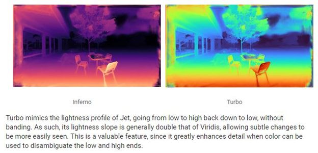 Google的团队将这个工具用于实现视差贴图、误差贴图以及许多其他标量的可视化中。您可以在下方链接中找到在Python和C/C++ 中的使用这几技术的方法,以及多项式逼近的方法——用于可能查表查询不太方便的情况中。