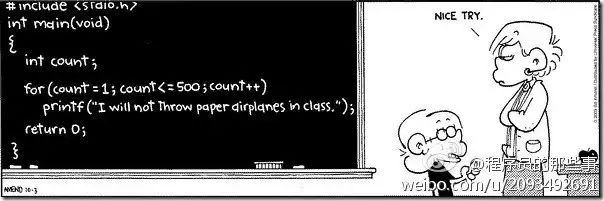 一个小朋友在课堂上玩纸飞机,被老师发现后罚写 500 遍“我再也不在课堂上扔纸飞机了”,于是他在黑板上写了一段代码……