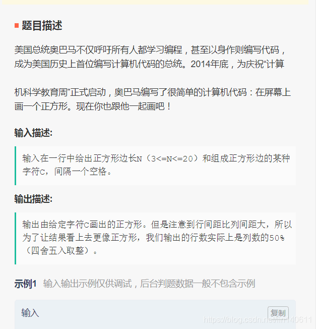 本文主要是介绍奥巴马一起编程-按照指定格式输出正方形(美国总统奥巴马不进呼吁所有人都学习编程,甚至以身作则编写代码,,输入在一行中给出的正方形的边长N和组成正方形的某种字符,间隔一个空格),希望对大家解决编程问题提供一定的参考价值,需要的开发者们随着小编来一起学习吧!