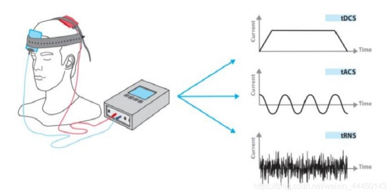 神经调节是指通过人工刺激(例如电流或化学试剂)引起的神经活动。它可能涉及诸如脊髓刺激或脑深部刺激之类的(高风险的)侵入性方法,其中电极直接植入要被刺激的神经上。它也可以使用诸如电刺激的方法非侵入地进行,其中外部电极在不需要手术植入的情况下诱导所需的神经活动变化,但是其中通过头皮安装的电极向头部施加低强度(mA)电流,如图1所示。用置于选定皮质区域上方的负极(阴极)刺激将降低电极下的神经元活动,而用正极(阳极)刺激将增加电极下的神经元活动。因此,该方法可用于引起特定脑区域中的皮质脑活动,或者可选地降低过度兴奋区域中的活动。该过程简单,经济且便携,人们可以在完全清醒下操作,相比其他的方法还降低了不适感。