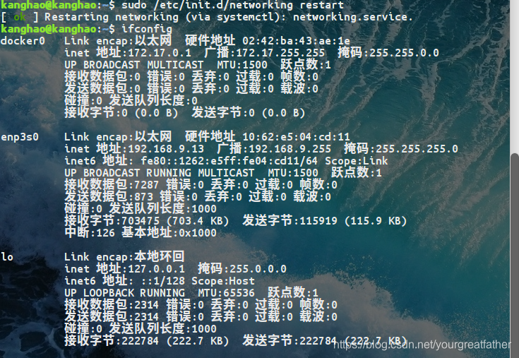 修改完成后保存并关闭interfaces文件,在终端输入命令sudo /etc/init.d/networking restart重启网络,终端显示ok后,再次输入ifconfig确认IP地址是否已设置生效,IP地址生效后如图5所示。