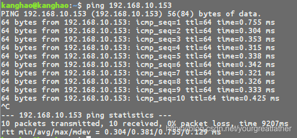 此时,测试计算机与激光雷达是否可以通信,在终端输入ping加激光雷达的IP地址,如ping 192.168.10.153,若上述配置过程无误,终端将显示图6所示内容。