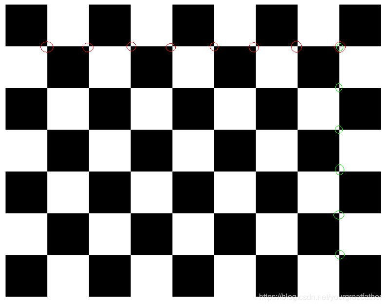 棋盘格规格使用A4纸大小,角点(图7中红色、绿色圆圈标记)数分别为8个及6个,单个棋盘格为0.024mm*0.024mm的正方形。请将打印出的高清A4大小棋盘格粘贴在平整、坚硬的平面上。