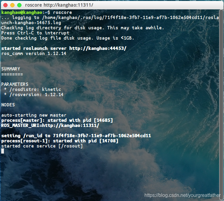 打开一个新的终端,输入roscore命令启动rosmaster。