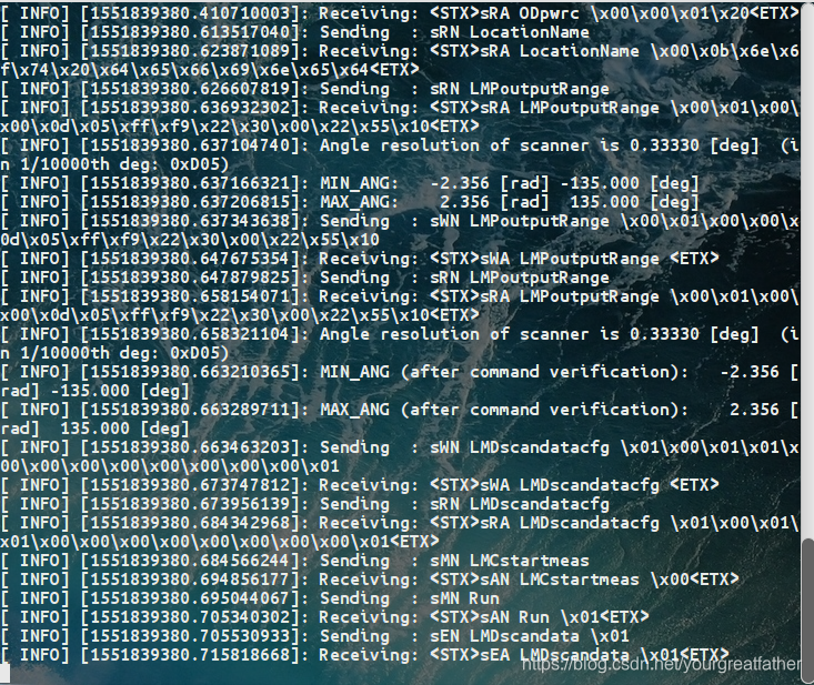 保持运行roscore的终端不要关闭,再打开一个新的终端进入ROS工作空间,输入source ./devel/setup.bash命令,随后输入roslaunch sick_scan sick_tim_5xx.launch命令启动激光雷达,若激光雷达启动成功如图9所示。
