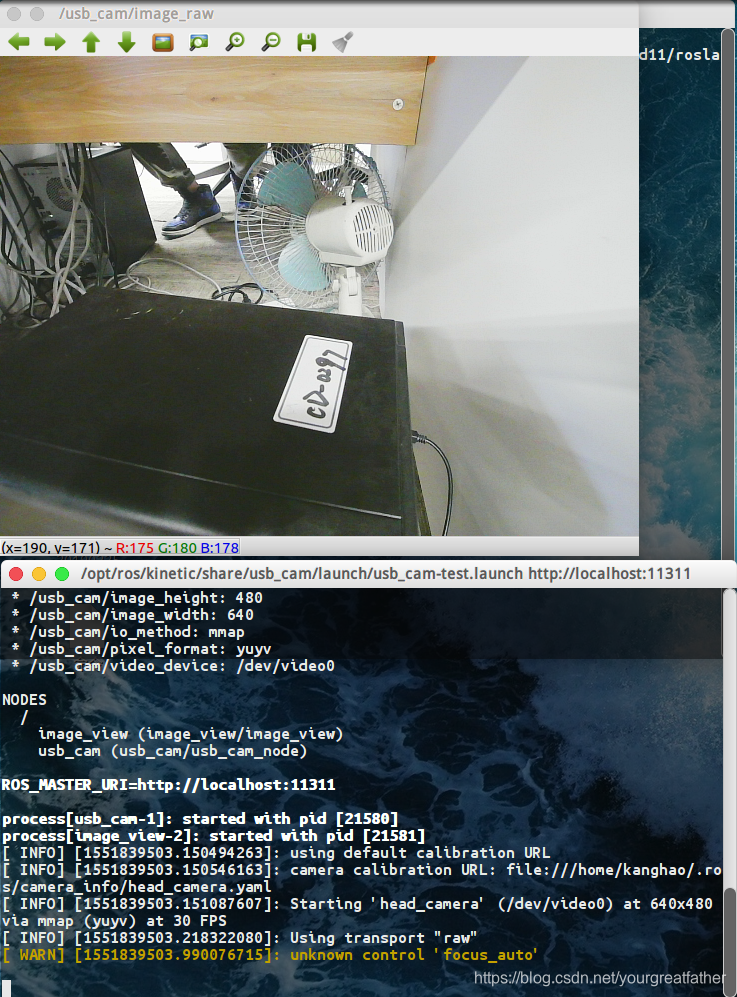 保持运行激光雷达的终端不要关闭,再打开一个新的终端进入ROS工作空间,输入source ./devel/setup.bash命令,随后输入roslaunch usb_cam usb_cam_test.launch命令启动USB摄像头,若USB摄像头启动成功如图10所示。