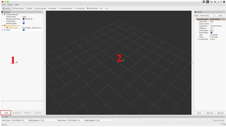 此时在该终端输入rosrun rviz rviz,启动rviz三维可视化平台,rviz界面如图12所示。其中1区域中显示预在rviz中显示的话题等信息,2区域将显示激光雷达信息。在rviz中,单击左下角Add按钮,将弹出添加话题对话框,单击By topic选项卡,分别选择添加/scan下的laserscan话题及/usb_cam/image_raw下的image话题,如图13所示。添加完毕后,将1区域的Global Opations中的fixed frame修改为laser。修改完成后,rviz中显示相机图像及激光点云,如图14所示。