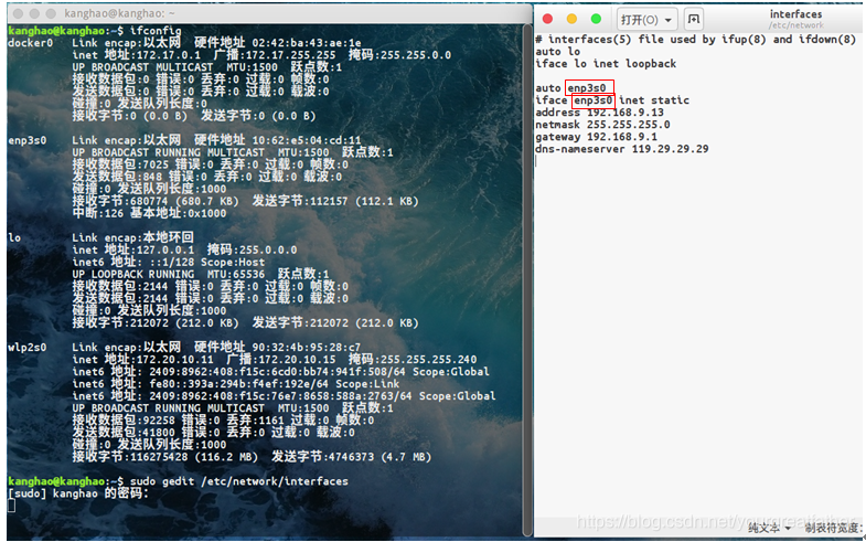 使用组合按键 Ctrl+Alt+T 打开终端,在终端输入 ifconfig 查看网卡及 IP 地址,如图 3 所示,其中红色框中显示的为网卡的名称。