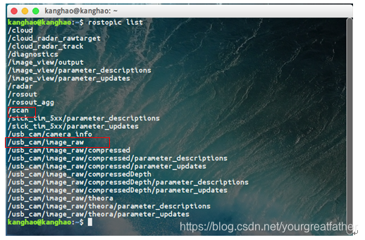此时打开一个新的终端,输入命令rostopic list,可以查看当前运行的ROS节点发布的话题,如图11所示。其中运行激光雷达的节点发布的话题为/scan,运行USB摄像头的节点发布的话题为/usb_cam/image_raw。