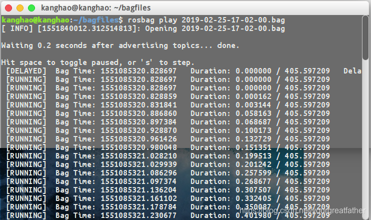 打开一个新的终端,进入保存rosbag的文件夹,输入命令rosbag play xx.bag播放刚才录制的rosbag,开始播放后立即按空格键暂停播放,如图16所示。