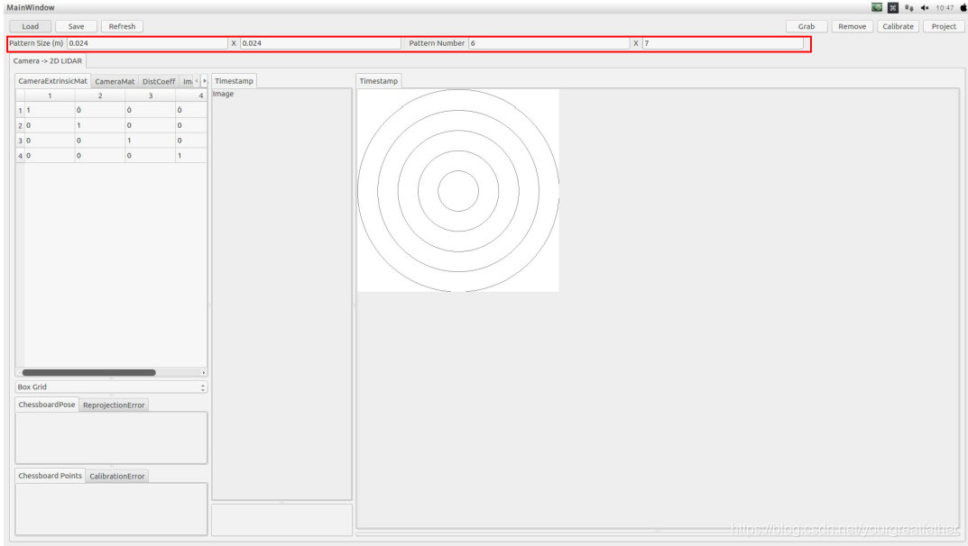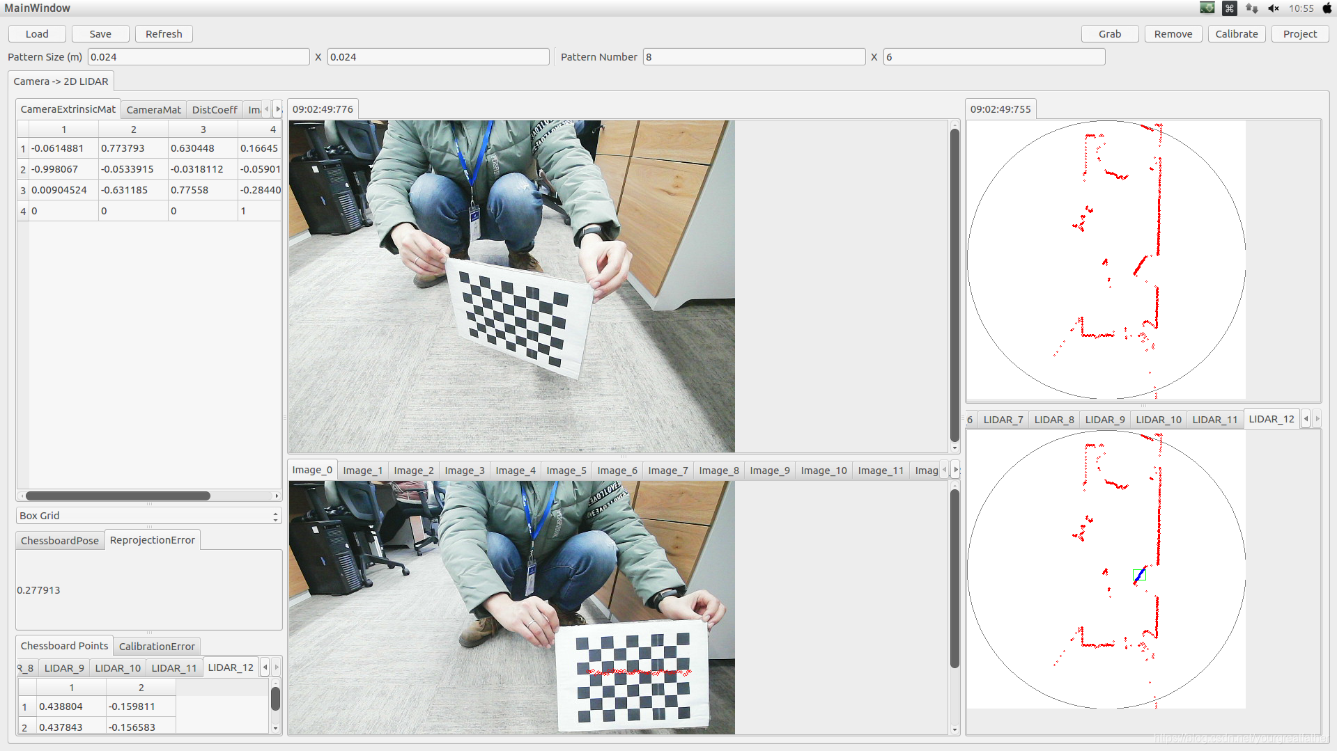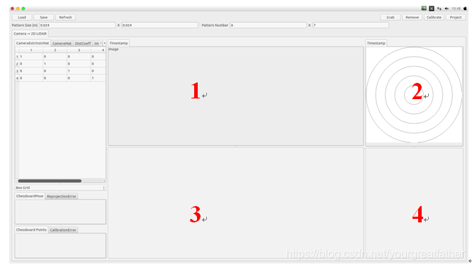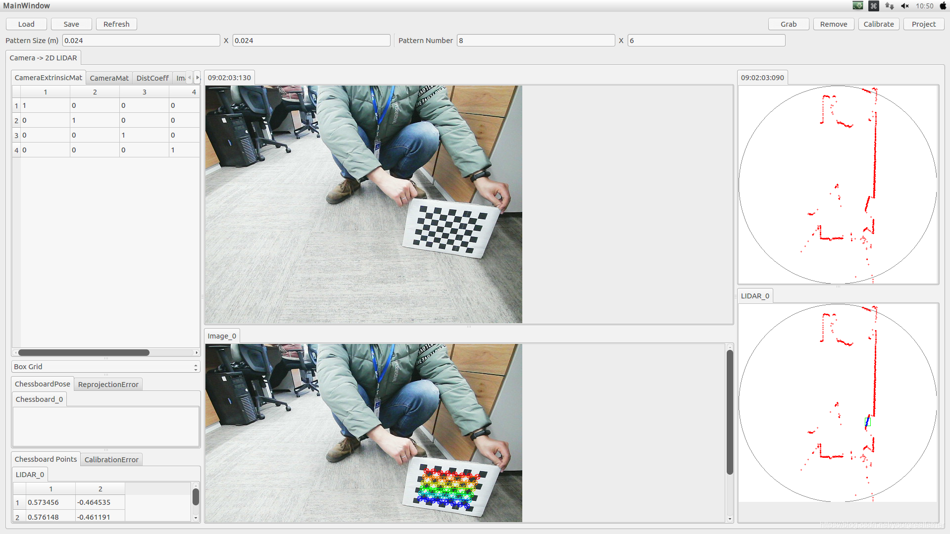 单击主界面右上角Grab按钮进行捕捉。捕捉后将在3区域显示相机图像的标定画面,4区域将显示该时刻的激光雷达点云;