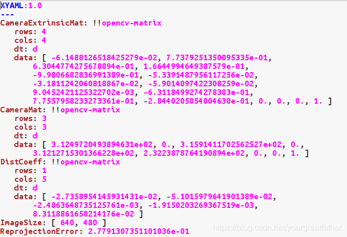 至此激光雷达及相机联合标定结束,得到标定结果yaml文件内容如图24所示,自行选择相关参数使用即可。