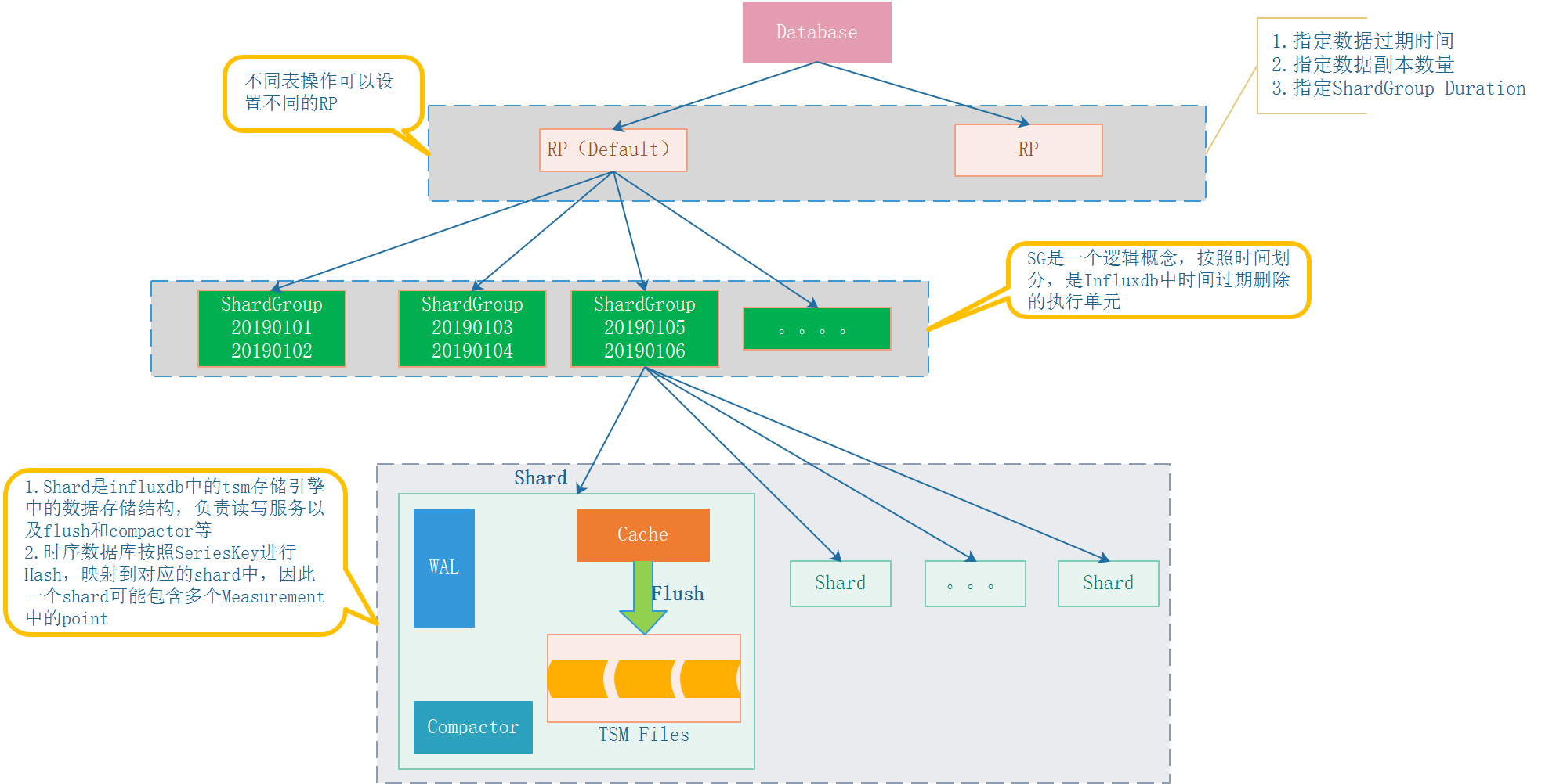 Shard Group实现了数据分区,但是Shard Group只是一个逻辑概念,在它里面包含了大量Shard,Shard才是InfluxDB中真正存储数据以及提供读写服务的概念,类似于HBase中Region,Kudu中Tablet的概念。在 InfluxDB 中按照数据的时间戳所在的范围,会去创建不同的 shard,每一个 shard 都有自己的 cache、wal、tsm file 以及 compactor,这样做的目的就是为了可以通过时间来快速定位到要查询数据的相关资源,加速查询的过程,并且也让之后的批量删除数据的操作变得非常简单且高效。