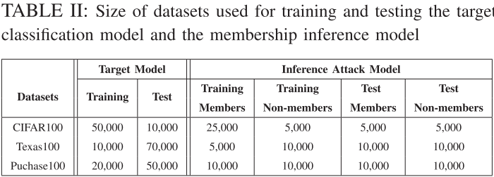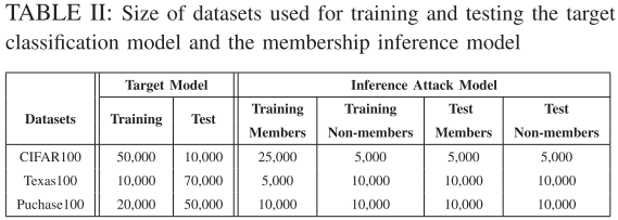 我们实现了我们的攻击,并将其性能与shokri等人的影子模型进行了比较。[6]前面介绍过。我们根据表II中的训练和测试数据集的大小,在各种数据集上训练我们的无监督模型。根据表II的训练大小在每个Texas100和Purchase100数据集上训练影子模型。【We train a single Shadow model on each of Texas100 and Purchase100 datasets using training sizes according to Table II.】影子模型的训练集与目标模型的训练集不重叠。但是,对于CIFAR100数据集,我们的影子模型使用与目标模型数据集重叠的训练数据集,因为我们没有足够的实例(我们在总共60000个可用记录中训练每个模型50000个实例)。