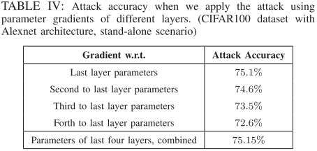 最后,表V显示了当我们将输出层和不同层的梯度相结合时的攻击精度。最后一层的梯度泄露了最多的成员信息。