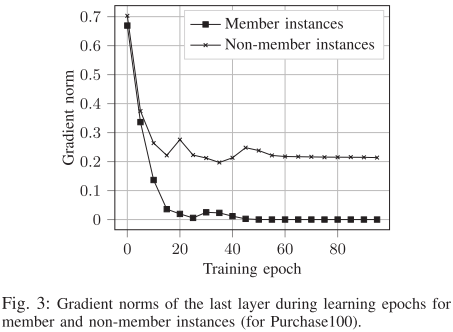 在这个实验中,我们证明了模型梯度的范数与成员推断的准确性高度相关,因为它在成员和非成员实例中的表现不同。图3为成员实例和非成员实例(Purchase100数据集)绘制了连续训练阶段最后一层的梯度规范。可见,在训练过程中,成员实例的梯度范数随训练时间的延长而减小,而非成员实例的梯度范数并不是这样。【the gradient norms of the member instances decrease over training epochs, which is not the case for non-member instances.】