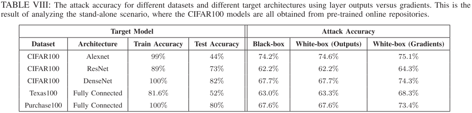 我们调查攻击者在白盒环境中访问完全训练的目标模型的情况。因此,攻击者可以利用目标模型隐藏层的输出和梯度来执行攻击。我们使用了预先训练过的CIFAR100模型,并使用表二所示的数据集大小训练了其他目标模型和攻击模型。