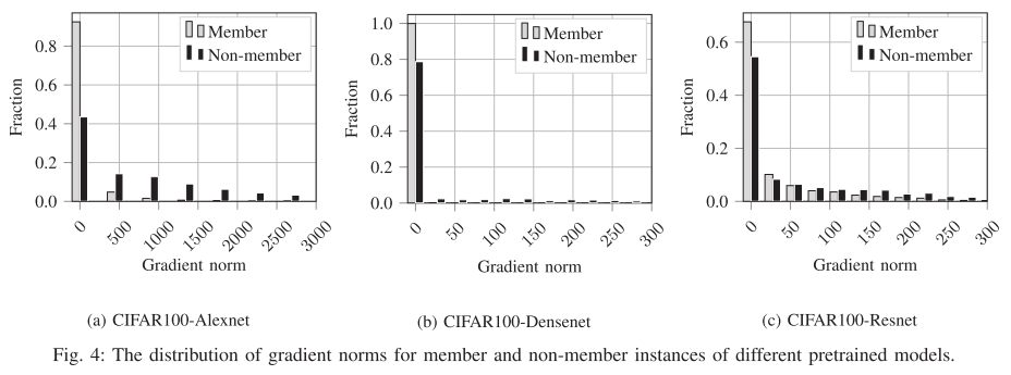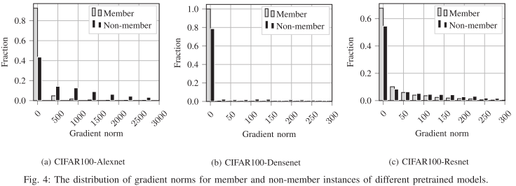 图4显示了CIFAR100上三种不同的预训练体系结构上的成员和非成员在最后一层的梯度规范的分布。