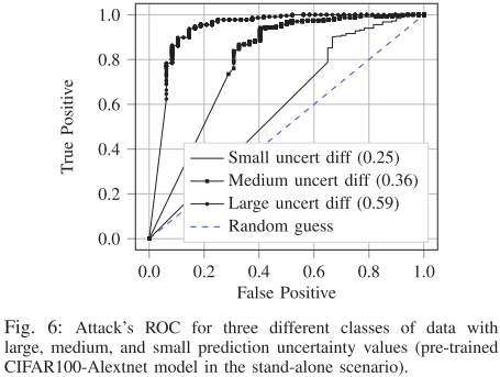 文献[6]认为:预测向量的不确定性是隐私泄露的重要因素。我们通过对不同预测不确定性的CIFAR100-Alexnet中不同类别的攻击进行评估,来验证这一说法。具体来说,我们选择了预测不确定性差异小、中和高的三个类别,其攻击精度如图6所示。类似于梯度范数的差异,预测不确定性值越高的类泄漏的成员信息越多。