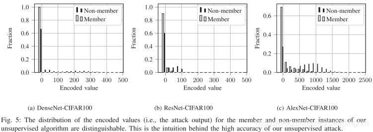 我们攻击工作背后的直观[【The intuition behind our attack working】,ours无监督算法的编码值对于成员和非成员样本呈现不同的分布。可以在图5中看到各种数据集和体系结构。