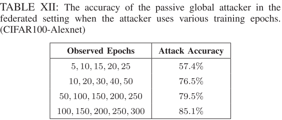 由于GPU资源有限,我们的攻击仅在五个(非连续)训练阶段观察每个目标参与者。表XII显示了当我们的攻击使用不同的训练时段集时的准确性(对于带有AlexNet的CIFAR100数据集)。我们看到,使用后期,大大提高了攻击精度。直观地说,这是因为早期的训练阶段包含了数据集的一般特征信息,这些特征不会泄露重要的成员信息,然而,当模型开始学习这些阶段中的异常值【outliers】时,后期的阶段包含了更多的成员信息[15]。