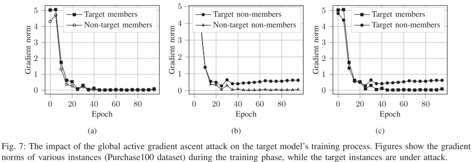 直观地说,这是因为对一个成员实例应用梯度上升算法将触发目标模型,试图通过在这些实例的模型梯度方向上下降来最小化其损失(从而消除攻击者上升的影响)。然而,对于目标非成员实例,模型不会显式地改变它们的梯度,因为它们不会影响训练损失函数。攻击者在训练的每个阶段都重复梯度上升算法,因此,在这种非成员实例上,模型的梯度会不断增加。图7c描述了成员和非成员目标实例的梯度范数之间的结果区别。主动梯度上升攻击迫使目标模型在目标成员和目标非成员实例之间表现出明显的差异,这使得成员推断攻击变得更加容易。结果表明,与被动全局攻击相比,主动攻击能显著提高攻击精度。在本地情况下,由于观察到来自多个参与者的聚合参数,其准确性低于全局攻击。