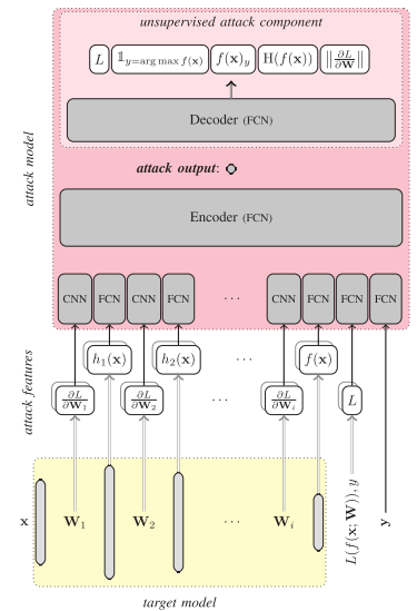 给定目标数据(x,y),攻击的目标是确定其在目标模型f的训练集D中的隶属度。攻击者在目标输入x上运行目标模型f,并在正向传递中计算所有隐藏层hi(x)、模型的输出f(x)和损失函数L(f(x),y;W)。攻击者还计算了每层∂L/∂W的参数在向后传递时的损失梯度。这些计算,除了真标签y的one-hot编码外,还构造了推理攻击的输入特征。攻击模型由卷积神经网络(cnn)和全连接网络(fcn)两部分组成。为了攻击联邦学习和微调,攻击者会观察每个攻击特性t次,并在将它们传递给相应的攻击组件之前将它们堆叠起来。例如,损失特征组成为L={L{1}、L{2}、···、l{t} }。CNN和FCN组件的输出被附加在一起,这个向量被传递给一个完全连接的编码器。在监督攻击环境中,该嵌入被训练成Pr{(x,y)∈D}。在无监督设置下,对译码器进行训练,从攻击输出中重构出攻击输入的重要特征。在无人监督的环境中,译码器是训练有素的重构攻击的重要特性输入(如模型的输出不确定度h (f (x))及其梯度范数