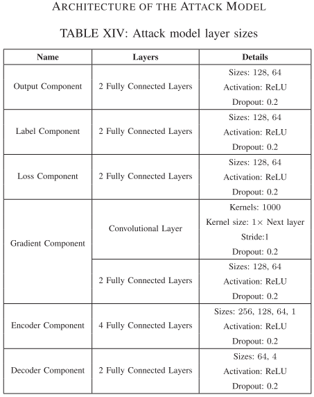 攻击模型的不同输入是:梯度∂L/∂W1,∂L/∂W2,···、不同层的激活向量集合h1(x),h2(x),···、模型输出f(x)、标签y的一位有效编码【the one-hot encoding】、以及目标数据L(f(x;W),y)上的模型损失。每一个都被单独输入到攻击模型中,并使用独立的组成部分分别进行分析。