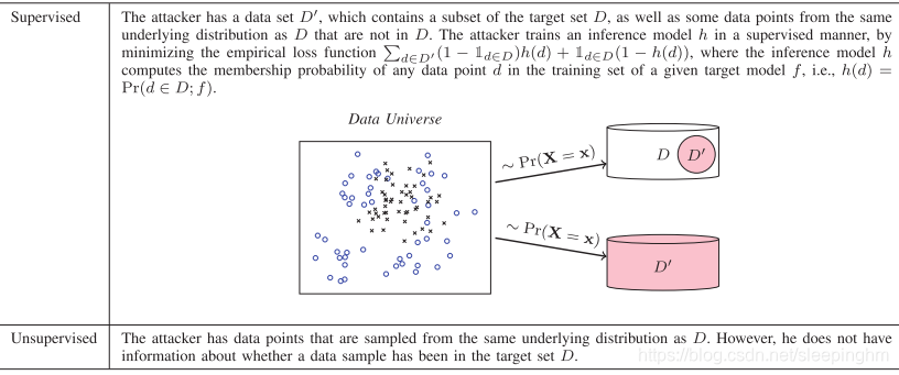 设h为推理攻击模型。在有监督的环境中,我们将攻击者的(均方根)损失最小化,以预测其训练集D'中数据点的成员身份: