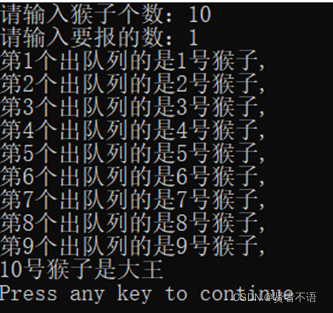 printf("第%d个出队列的是%d号猴子,\n",j++,p->data);