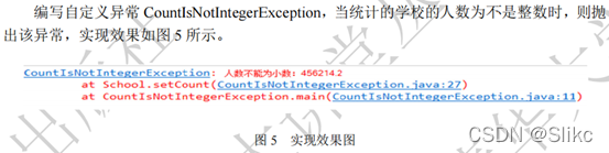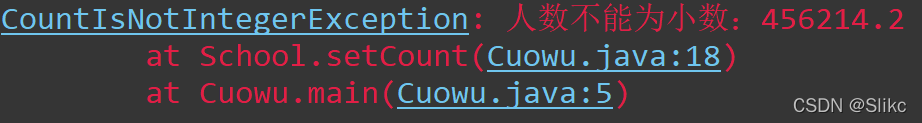 class School { //学校类private Number count;//存放学校人数数量public void setCount(Number count) {//方法名,返回参数countInteger i = count.intValue();// 把人数转为整数Double d = count.doubleValue();// 把人数转为浮点数double di = i;// 整数付给浮点数if (d.equals(di)) {// 如果两个浮点数数值相同this.count = count;//this关键词} else {// 否则抛异常try {//try代码块处理可能出现异常的代码throw new CountIsNotIntegerException("人数不能为小数:" + d);//输出人数不能为小数} catch (CountIsNotIntegerException e) {//捕捉错误信息e.printStackTrace();//输出异常性质}}}