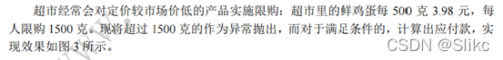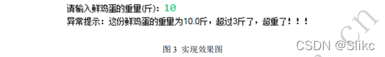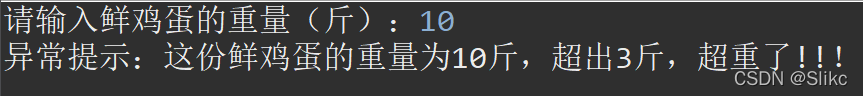public class Q12 {//创建类public static void main(String[] args) {//主方法System.out.print("请输入鲜鸡蛋的重量(斤):");//输出请输入鲜鸡蛋的重量(斤):Scanner a=new Scanner(System.in);//从键盘获取输入的值放入scannerint egg=a.nextInt();//把scanner的值赋予给eggif(egg<=7){//判断鸡蛋重量System.out.println("应付"+egg*3.98+"元");//重量小于7的话输出“应付"+egg*3.98+"元”}else{//else语句try{ //try代码块处理可能出现异常int ar=Integer.parseInt("24的");}catch(Exception e){//捕捉异常信息System.out.println("异常提示:这份鲜鸡蛋的重量为"+egg+"斤,超出3斤,超重了!!!");//反之输出"异常提示:"+"这份鲜鸡蛋的重量为10.0斤"}}}