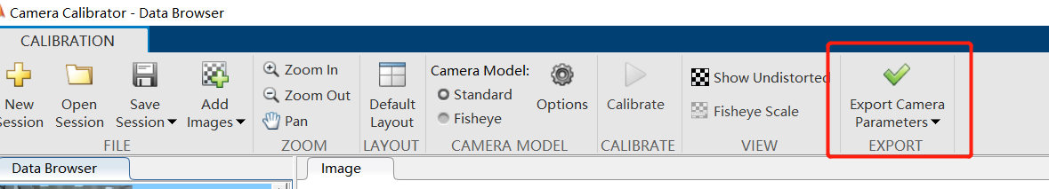 步骤4:导出参数,即可把参数进行保存,保存后可退出标定应用,在MATLAB主界面中将保存的Mat文件打开。