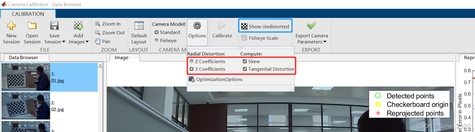 实验表明,在MATLAB中选择使用三个参数,并且选择错切和桶形畸变,关于三个参数还是两个参数,可以根据自己的试验效果选择 。点击 Calibrate 后等待一段时间即可完成标定,标定完成后可通过点击 show Undistorted 对比校正前后效果。