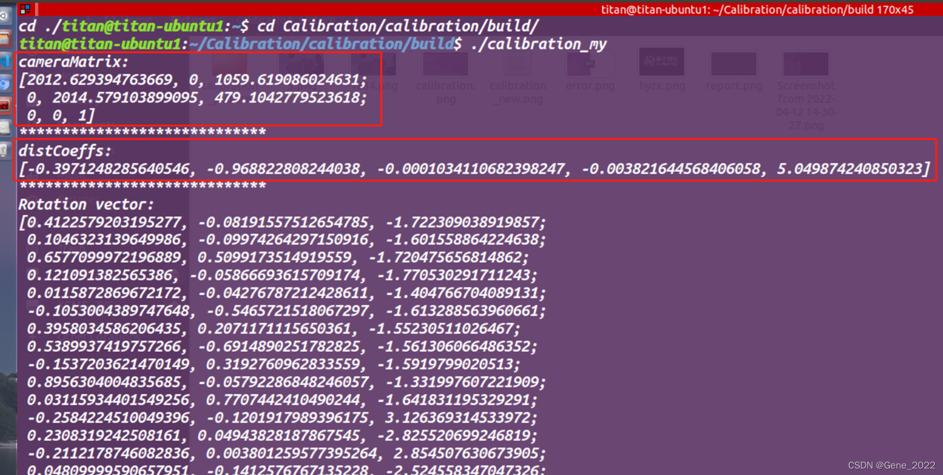 运行上述程序,经过一番图片处理与切换,最终通过终端得到获取相机内参及畸变系数。