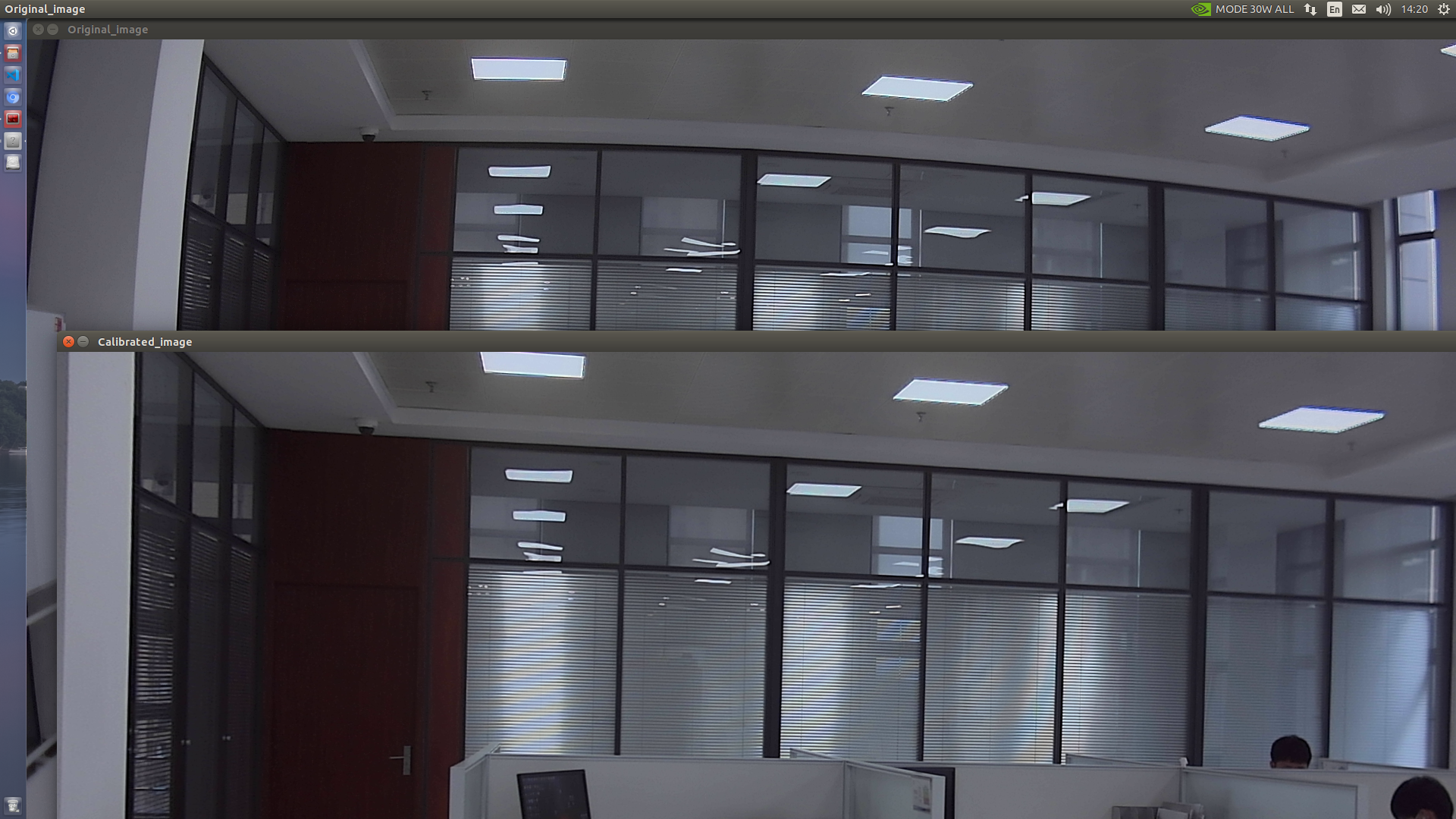 */Mat view, rview, map1, map2;Size image_Size;image_Size = frame.size();initUndistortRectifyMap(cameraMatrix, distCoeffs, Mat(), cameraMatrix, image_Size, CV_16SC2, map1, map2);// initUndistortRectifyMap(cameraMatrix, distCoeffs, Mat(),getOptimalNewCameraMatrix(cameraMatrix, distCoeffs, image_Size, 0.5, image_Size, 0),image_Size, CV_16SC2, map1, map2);while(1){inputVideo >> frame;if(frame.empty()) break;remap(frame, frameCalibration, map1, map2, INTER_LINEAR);imshow("Original_image",frame);imshow("Calibrated_image", frameCalibration);char key =waitKey(1);if(key == 27 || key == 'q' || key == 'Q') break;}return 0;