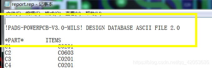 第三步:用记事本打开asc文件,并修改抬头。这个抬头来源于支持PADS的网表格式。可以在报告中查看 如下图