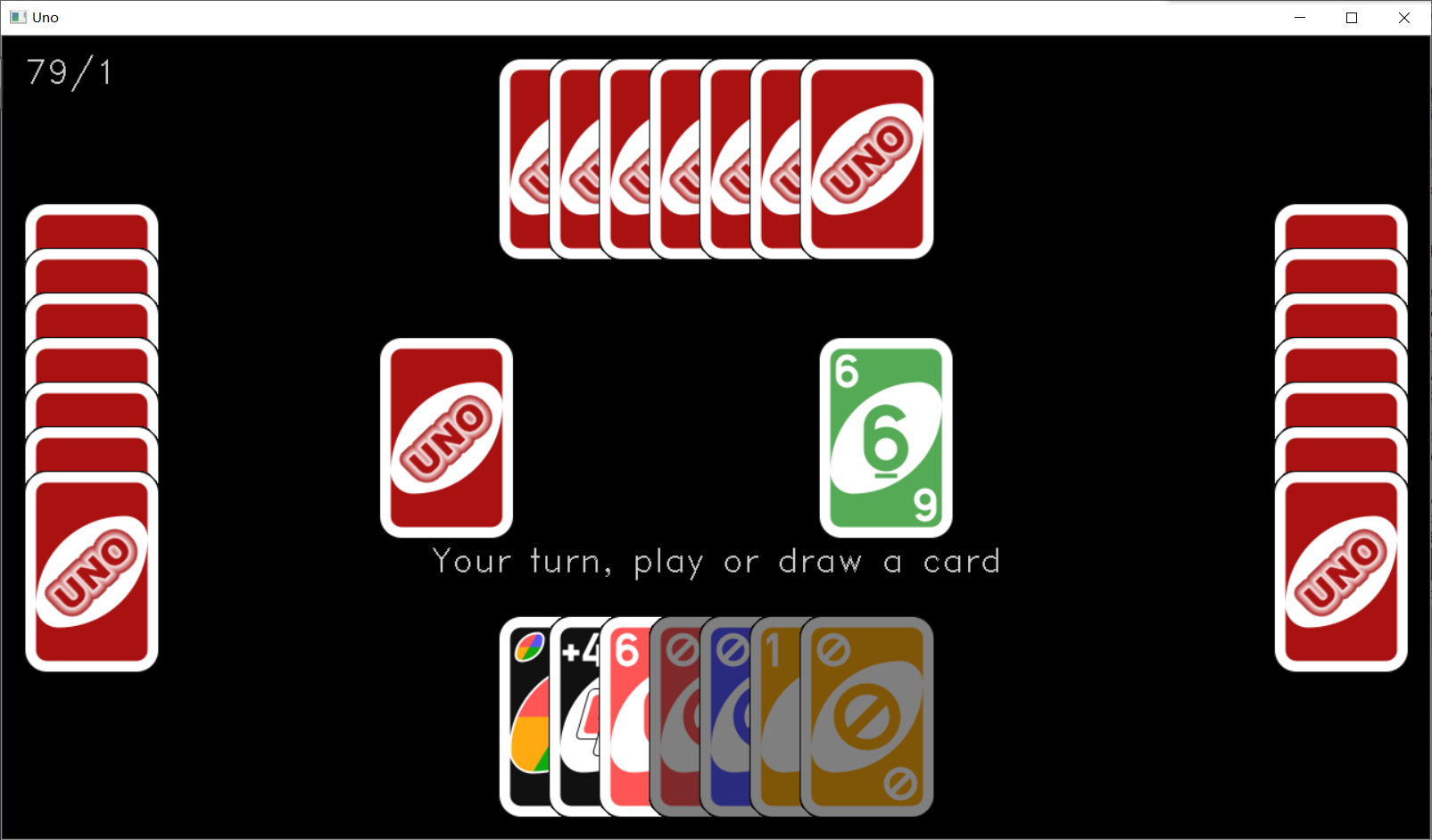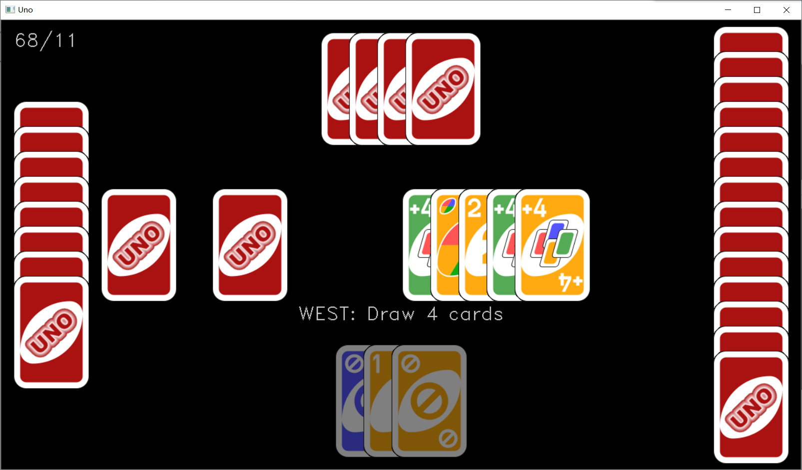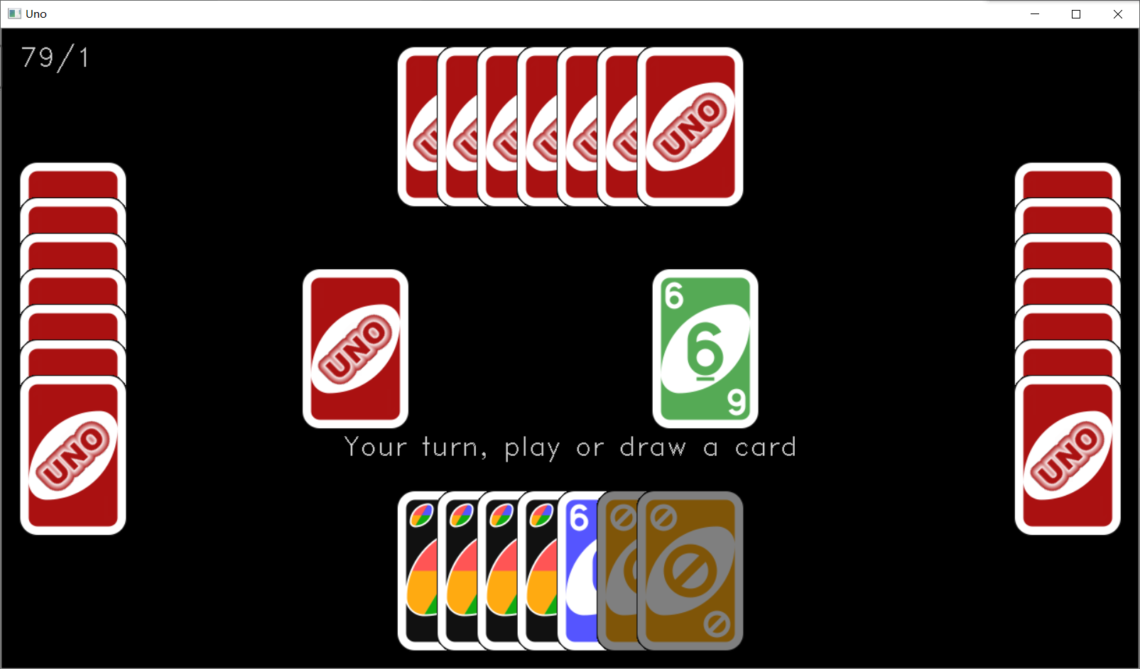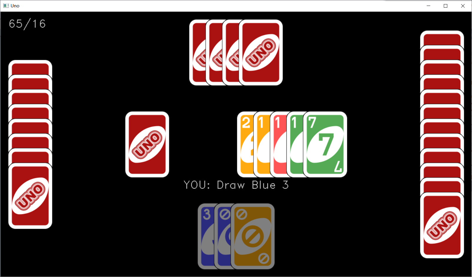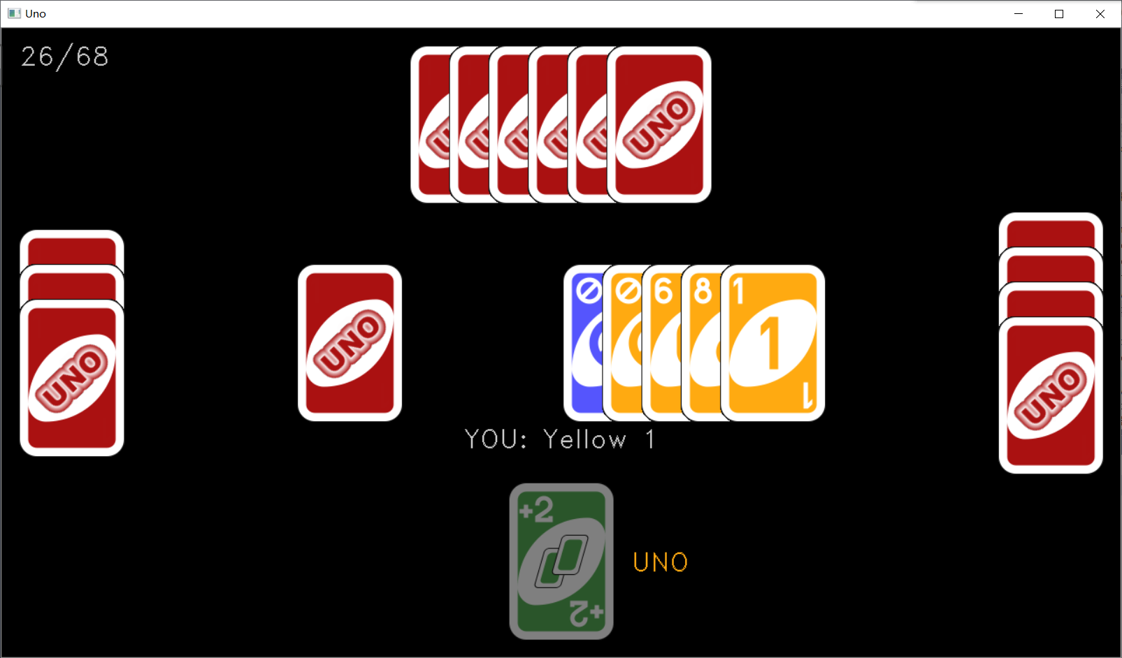 然后运行程序,当点击了屏幕中央的 UNO 时,如果出现了类似下图这样的游戏界面,就说明我们游戏画面绘制成功了。我这盘运气还挺好的,开局四张黑牌的说。